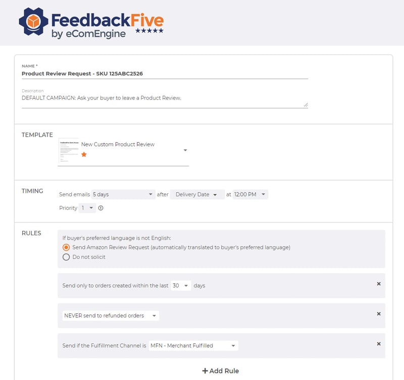 The same can be true for Amazon feedback requests. FeedbackFive allows you to customize when your automated requests are sent based on rules that make sense for your products and customers. Note that Amazon requires these messages to be sent within 30 days of order completion.