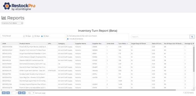 A high inventory turn ratio means units are selling quickly, and a low one means that units are staying in the Amazon warehouse for a long time.